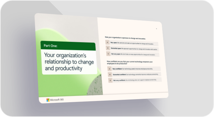 10 Rate your organization’s openness to change and innovation. A Very open: We welcome and seek out opportunities for change and innovation. Part One: B Somewhat open: We approach opportunities for change and innovation with caution. Your organization’s C Not very open: We don’t take on many opportunities for change and innovation. relationship to change How confident are you that your current technology empowers your employees to be productive? and productivity A Very confident: Our technology greatly improves employee productivity. B Somewhat confident: Our technology somewhat improves employee productivity. C Not very confident: Our technology does not support employee productivity.