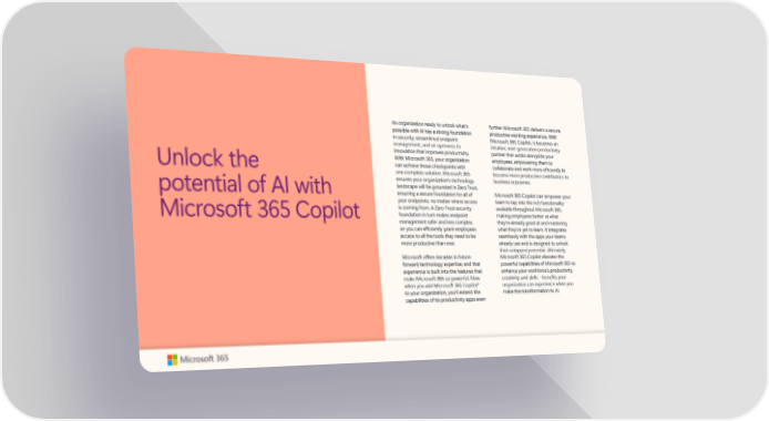 An organization ready to unlock what’s further. Microsoft 365 delivers a secure, possible with AI has a strong foundation productive working experience. With in security, streamlined endpoint Microsoft 365 Copilot, it becomes an management, and an openness to intuitive, next-generation productivity innovation that improves productivity. partner that works alongside your With Microsoft 365, your organization employees, empowering them to Unlock the can achieve those checkpoints with collaborate and work more efÏciently to one complete solution. Microsoft 365 become more productive contributors to ensures your organization's technology business outcomes. landscape will be grounded in Zero Trust, potential of AI with ensuring a secure foundation for all of Microsoft 365 Copilot can empower your your endpoints, no matter where access team to tap into the rich functionality is coming from. A Zero Trust security available throughout Microsoft 365, foundation in turn makes endpoint making employees better at what Microsoft 365 Copilot management safer and less complex, they’re already good at and mastering so you can efÏciently grant employees what they’ve yet to learn. It integrates access to all the tools they need to be seamlessly with the apps your teams more productive than ever. already use and is designed to unlock their untapped potential. Ultimately, Microsoft offers decades in future- Microsoft 365 Copilot elevates the forward technology expertise, and that powerful capabilities of Microsoft 365 to experience is built into the features that enhance your workforce’s productivity, make Microsoft 365 so powerful. Now, creativity, and skills—benefits your when you add Microsoft 365 Copilot* organization can experience when you to your organization, you'll extend the make the transformation to AI. capabilities of its productivity apps even