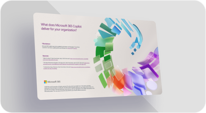 What does Microsoft 365 Copilot deliver for your organization? *Disclaimer: Microsoft 365 Copilot may not be available for all markets and languages. To purchase, customers must have a qualifying Microsoft 365 plan for enterprise or business. Sources: 1“Will AI Fix Work?” Work Trend Index, May 9, 2023. Microsoft. https://www.microsoft.com/en-us/worklab/ work-trend-index/will-ai-fix-work. 2 “The New Performance Equation in the Age of AI.” Work Trend Index, April 20, 2023. Microsoft. https://www. microsoft.com/en-us/worklab/work-trend-index/the-new-performance-equation-in-the-age-of-ai. 3“A Whole New Way of Working.” Work Trend Index. Microsoft. https://www.microsoft.com/en-us/worklab/ai- a-whole-new-way-of-working. ©2024 Microsoft Corporation. All rights reserved. This document is provided “as-is.” Information and views expressed in this document, including URL and other Internet website references, may change without notice. You bear the risk of using it. This document does not provide you with any legal rights to any intellectual property in any Microsoft product. You may copy and use this document for your internal, reference purposes.