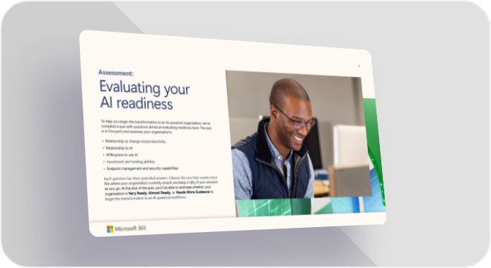 9 Assessment: Evaluating your AI readiness To help you begin the transformation to an AI-powered organization, we’ve compiled a quiz with questions aimed at evaluating readiness level. The quiz is in five parts and assesses your organization's: • Relationship to change and productivity • Relationship to AI • Willingness to use AI • Investment and funding abilities • Endpoint management and security capabilities Each question has three potential answers. Choose the one that sounds most like where your organization currently stands and keep a tally of your answers as you go. At the end of the quiz, you’ll be able to estimate whether your organization is Very Ready, Almost Ready, or Needs More Guidance to begin the transformation to an AI-powered workforce.