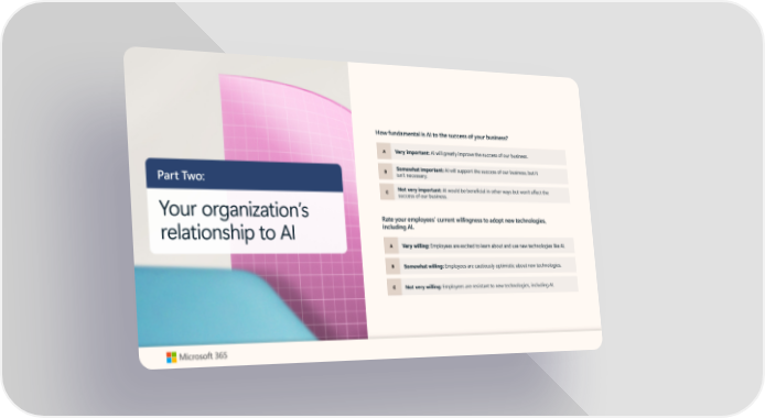 How fundamental is AI to the success of your business? A Very important: AI will greatly improve the success of our business. B Somewhat important: AI will support the success of our business, but it Part Two: isn’t necessary. C Not very important: AI would be beneficial in other ways but won’t affect the success of our business. Your organization’s Rate your employees’ current willingness to adopt new technologies, relationship to AI including AI. A Very willing: Employees are excited to learn about and use new technologies like AI. B Somewhat willing: Employees are cautiously optimistic about new technologies. C Not very willing: Employees are resistant to new technologies, including AI.