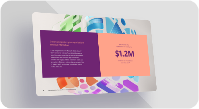 Govern and protect your organization’s With Microsoft 365, organizations can expect up to sensitive information A fully integrated solution, Microsoft 365 E3 allows IT teams to discover and classify sensitive information at scale. Information protection can even extend between $1.2M Microsoft and non-Microsoft apps. Features like sensitive data tagging and loss prevention, end-to-end in reduced risk of data breach encryption, eDiscovery, and compliance managers help 11 over three years IT Teams classify, monitor, and control data—both in transit and at rest. 9 A Secure Foundation: From Zero Trust to AI-powered productivity