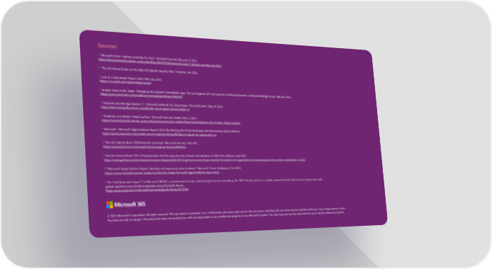 Sources: 1 “Microsoft Entra: 5 identity priorities for 2023.” Microsoft Security Blog, Jan 9, 2023. https://www.microsoft.com/en-us/security/blog/2023/01/09/microsoft-entra-5-identity-priorities-for-2023/ 2 “The 3rd Annual Study on the State of Endpoint Security Risk,” Ponemon, Jan 2020. 3 Cost of a Data Breach Report 2023, IBM, July 2023. https://www.ibm.com/reports/data-breach 4 Gruber, Dave; Knuth, Gabe, “Managing the Endpoint Vulnerability Gap: The Convergence of It and Security to Reduce Exposure.” Enterprise Strategy Group, February 2023. https://query.prod.cms.rt.microsoft.com/cms/api/am/binary/RWXwKT 5 “Discover and Manage Shadow IT - Microsoft Defender for Cloud Apps.” Microsoft Learn, May 24, 2023. https://learn.microsoft.com/en-us/defender-cloud-apps/tutorial-shadow-it 6 “Anatomy of a Modern Attack Surface.” Microsoft Security Insider, May 2, 2023. https://www.microsoft.com/en-us/security/business/security-insider/threat-briefs/anatomy-of-a-modern-attack-surface/ 7 Microsoft, “Microsoft Digital Defense Report 2022: Illuminating the threat landscape and empowering digital defense.” https://query.prod.cms.rt.microsoft.com/cms/api/am/binary/RE5bUvv?culture=en-us&country=us 8 “Security Signals Boost SDM Research Learnings” Microsoft Security, Sep 2021. https://query.prod.cms.rt.microsoft.com/cms/api/am/binary/RWP0mz 9 Gartner Survey Shows 75% of Organizations Are Pursuing Security Vendor Consolidation in 2022, Press Release, Sep 2022. https://www.gartner.com/en/newsroom/press-releases/2022-09-12-gartner-survey-shows-seventy-five-percent-of-organizations-are-pursuing-security-vendor-consolidation-in-2022 10 “Microsoft Digital Defense Report: Building and improving cyber resilience.” Microsoft Threat Intelligence, Oct 2023. https://www.microsoft.com/en-us/security/security-insider/microsoft-digital-defense-report-2023 11 The Total Economic Impact™ of Microsoft 365 E3, a commissioned study conducted by Forrester Consulting, Oct 2022. Results based on a single composite United States-based organization with global operations and 30,000 employees using Microsoft 365 E3. https://query.prod.cms.rt.microsoft.com/cms/api/am/binary/RE5970p © 2023 Microsoft Corporation. All rights reserved. This document is provided “as-is.” Information and views expressed in this document, including URL and other Internet website references, may change without notice. You bear the risk of using it. This document does not provide you with any legal rights to any intellectual property in any Microsoft product. You may copy and use this document for your internal, reference purposes.