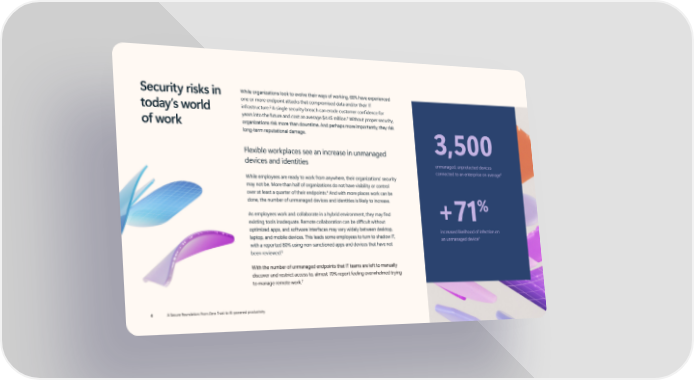 Security risks in While organizations look to evolve their ways of working, 68% have experienced one or more endpoint attacks that compromised data and/or their IT today’s world infrastructure.2 A single security breach can erode customer confidence for years into the future and cost an average $4.45 million.3 Without proper security, of work organizations risk more than downtime. And perhaps more importantly, they risk long-term reputational damage. Flexible workplaces see an increase in unmanaged 3,500 devices and identities unmanaged, unprotected devices connected to an enterprise on average6 While employees are ready to work from anywhere, their organizations’ security may not be. More than half of organizations do not have visibility or control 4 over at least a quarter of their endpoints. And with more places work can be done, the number of unmanaged devices and identities is likely to increase. % As employees work and collaborate in a hybrid environment, they may find +71 existing tools inadequate. Remote collaboration can be difÏcult without optimized apps, and software interfaces may vary widely between desktop, increased likelihood of infection on laptop, and mobile devices. This leads some employees to turn to shadow IT, an unmanaged device6 with a reported 80% using non-sanctioned apps and devices that have not been reviewed.5 With the number of unmanaged endpoints that IT teams are left to manually discover and restrict access to, almost 70% report feeling overwhelmed trying 7 to manage remote work. 4 A Secure Foundation: From Zero Trust to AI-powered productivity