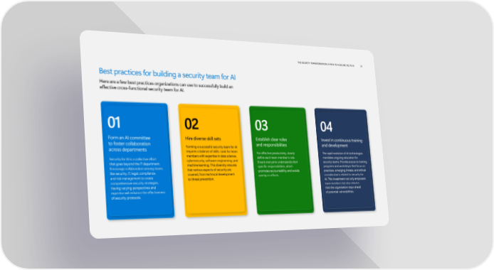 The seCURITy TRaNsfORmaTION: a paTh TO a seCURe yes TO aI 21 Best practices for building a security team for AI Here are a few best practices organizations can use to successfully build an effective cross-functional security team for AI. 01 02 03 04 Form an AI committee Hire diverse skill sets Establish clear roles Invest in continuous training to foster collaboration Forming a successful security team for AI and responsibilities and development across departments requires a balance of skills. Look for team For effective productivity, clearly The rapid evolution of AI technologies members with expertise in data science, define each team member’s role. mandates ongoing education for Security for AI is a collective effort cybersecurity, software engineering, and that goes beyond the IT department. Ensure everyone understands their security teams. Provide access to training machine learning. This diversity ensures Encourage collaboration among teams specific responsibilities, which programs and workshops that focus on that various aspects of security are promotes accountability and avoids practices, emerging threats, and ethical like security, IT, legal, compliance, covered, from technical development overlap in efforts. considerations related to security for and risk management to create to threat prevention. AI. This investment not only empowers comprehensive security strategies. team members but also ensures Having varying perspectives and that the organization stays ahead expertise will enhance the effectiveness of security protocols. of potential vulnerabilities.