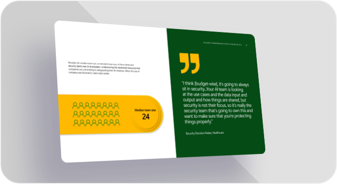 The seCURITy TRaNsfORmaTION: a paTh TO a seCURe yes TO aI 20 Notably, the median team size, or intended team size, of these dedicated security teams was 24 employees—underscoring the substantial resources that companies are committing to safeguarding their AI initiatives. When the size of company was factored in, team sizes varied. “I think [budget-wise], it’s going to always sit in security...Your AI team is looking at the use cases and the data input and output and how things are shared, but security is not their focus, so it’s really the Median team size security team that’s going to own this and 24 want to make sure that you’re protecting things properly.” Security Decision Maker, Healthcare