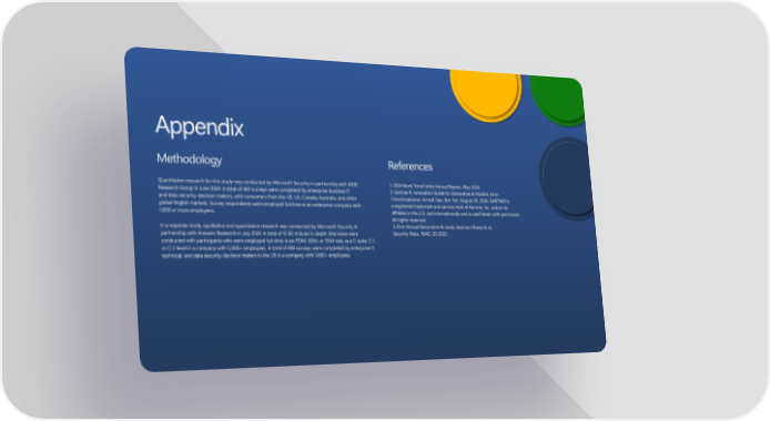 Appendix Methodology References Quantitative research for this study was conducted by Microsoft Security in partnership with MDC 1. 2024 Work Trend Index Annual Report, May 2024 Research Group in June 2024. A total of 402 surveys were completed by enterprise business IT 2. Gartner®, Innovation Guide for Generative AI Models, Arun and data security-decision makers, with consumers from the US, UK, Canada, Australia, and other Chandrasekaran, Arnold Gao, Ben Yan, August 26, 2024. GARTNER is global English markets. Survey respondents were employed full time at an enterprise company with a registered trademark and service mark of Gartner, Inc. and/or its 1,000 or more employees. afÏliates in the U.S. and internationally and is used herein with permission. All rights reserved. In a separate study, qualitative and quantitative research was conducted by Microsoft Security in 3. First Annual Generative AI study: Business Rewards vs. partnership with Answers Research in July 2024. A total of 15 60-minute in-depth interviews were Security Risks, ISMG, Q3 2023 conducted with participants who were employed full-time in an ITDM, SDM, or TDM role, as a C-suite, C-1, or C-2 level in a company with 5,000+ employees. A total of 409 surveys were completed by enterprise IT, technical, and data security-decision makers in the US in a company with 1,000+ employees.