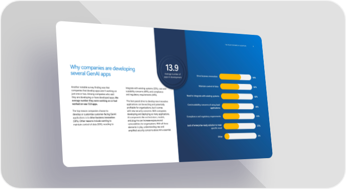 The pUsh fOR RapID aI aDOpTION 9 13.9 Why companies are developing Average number of Drive business innovation 58% several GenAI apps apps in development Maintain control of data 55% Another notable survey finding was that integrate with existing systems (52%), cost and companies that develop apps aren’t working on scalability concerns (49%), and compliance just one or two. Among companies who said and regulatory requirements (44%). Need to integrate with existing systems 52% they are developing or have developed apps, the average number they were working on or had This fast-paced drive to develop new innovative worked on was 13.9 apps. applications can be exciting and potentially Cost/scalability concerns of using SaaS 49% profitable for organizations, but it comes applications The top reason companies choose to with new security concerns. With companies develop or customize customer-facing GenAI developing and deploying so many applications, applications is to drive business innovation AI components like orchestrators, models, Compliance and regulatory requirements 44% (58%). Other reasons include wanting to and plug-ins can increase exposure and maintain control of data (55%), needing to vulnerabilities for organizations. With all these Lack of enterprise-ready solution to meet elements in play, understanding new and 37% specific need amplified security concerns about AI is essential. Other 2%