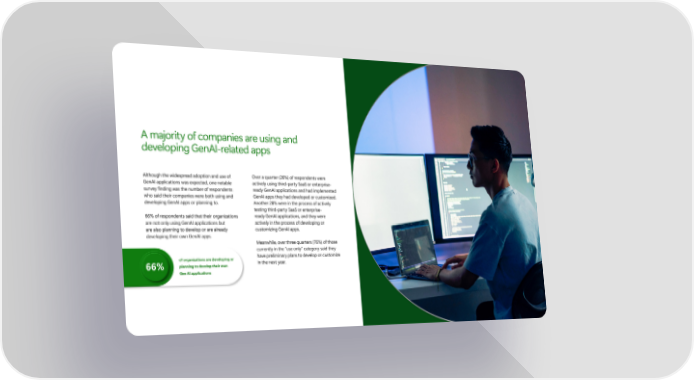 A majority of companies are using and developing GenAI-related apps Although the widespread adoption and use of Over a quarter (26%) of respondents were GenAI applications was expected, one notable actively using third-party SaaS or enterprise- survey finding was the number of respondents ready GenAI applications and had implemented who said their companies were both using and GenAI apps they had developed or customized. developing GenAI apps or planning to. Another 28% were in the process of actively testing third-party SaaS or enterprise- ready GenAI applications, and they were 66% of respondents said that their organizations are not only using GenAI applications but actively in the process of developing or customizing GenAI apps. are also planning to develop or are already developing their own GenAI apps. Meanwhile, over three quarters (76%) of those currently in the “use only” category said they of organizations are developing or have preliminary plans to develop or customize 66% planning to develop their own in the next year. Gen AI applications