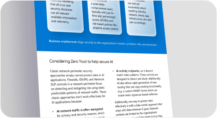 Zero Trust and AI: a symbiotic 8 relationship for end-to-end security Verify explicitly Use least Assume breach Protect assets against privilege access Assume attackers attacker control by Limit access of can and will explicitly validating a potentially successfully attack that all trust and compromised asset, anything (identity, security decisions typically with just-in- network, device, app, use all relevant time and just-enough- infrastructure, etc.) and available information access (JIT/JEA) and plan accordingly. and telemetry. risk-based policies like adaptive access control. Business enablement: Align security to the organization’s mission, priorities, risks, and processes. Considering Zero Trust to help secure AI Classic network-perimeter security • AI activity is dynamic, so it doesn’t approaches simply cannot protect data or AI match static patterns. These controls are applications. Firewalls, IDS/IPS, and Network designed to detect and block. Additionally, DLP controls in a network perimeter focus AI also allows rapid generation of new on detecting and mitigating risk using static tooling that can copy existing functionality predictable patterns of network traffic. These (e.g. a custom NMAP clone) which can classic approaches don’t work effectively for evade static signature-based defenses. AI applications because: Additionally, one way to protect data • AI network traffic is often encrypted effectively is with a data-centric approach that for privacy and security reasons, which stays with data wherever it goes. Network prevents these network-based controls controls are limited to the organization’s from getting any visibility. security perimeter and the assets in it so they cannot protect data on mobile devices, cloud • AI operates at data and application services, USB drives, and other locations. For abstraction layers, so differentiating these reasons, a Zero Trust asset-centric and between dangerous and safe actions/ data-centric approach is an effective way to communications requires controls that protect AI and related data assets. understand applications, data, and users.