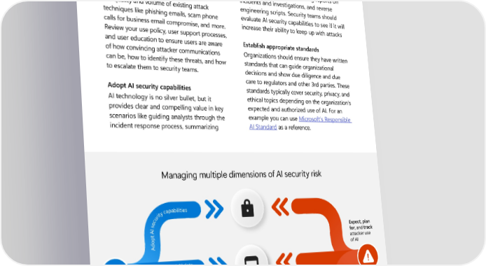 Strategic imperatives for security strategy 6 Provide guidance to users the impact of an attack, building reports on Attackers are already using AI to increase incidents and investigations, and reverse the quality and volume of existing attack engineering scripts. Security teams should techniques like phishing emails, scam phone evaluate AI security capabilities to see if it will calls for business email compromise, and more. increase their ability to keep up with attacks Review your use policy, user support processes, and user education to ensure users are aware Establish appropriate standards of how convincing attacker communications Organizations should ensure they have written can be, how to identify these threats, and how standards that can guide organizational to escalate them to security teams. decisions and show due diligence and due care to regulators and other 3rd parties. These Adopt AI security capabilities standards typically cover security, privacy, and AI technology is no silver bullet, but it ethical topics depending on the organization’s provides clear and compelling value in key expected and authorized use of AI. For an scenarios like guiding analysts through the example you can use Microsoft’s Responsible incident response process, summarizing AI Standard as a reference. Managing multiple dimensions of AI security risk Protect AI data and applications abilities p a c y t i r u c e s AI Expect, plan t for, and track dop attacker use A of AI Protect AI data and applications User educa tion and policy