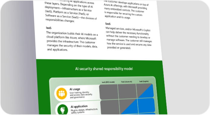 Adapting security for AI 13 The table below summarizes the shared PaaS responsibilities between organizations and AI The customer develops applications on top of providers in securing AI applications across Azure AI offerings, with Microsoft providing these layers. Depending on the type of AI many embedded controls. The customer deployment—Infrastructure as a Service is responsible for securing the custom (IaaS), Platform as a Service (PaaS), or application and its usage. Software as a Service (SaaS)—the division of responsibilities changes: SaaS Managed services, and/or Microsoft’s Copilot IaaS can help deliver the necessary functionality The organization builds their AI models on a without the customer needing to develop or cloud platform like Azure, where Microsoft manage software. The customer still manages provides the infrastructure. The customer how the service is used and secures any data manages the security of their models, data, provided or generated. and applications. AI security shared responsibility model IaaS (BYO model) PaaS (Azure AI) SaaS (Copilot) AI usage User training, identity and access, data security and governance AI application Plugins, design, infrastructure, safety systems AI platform Model safety, accountability, tuning, design, training data governance Organization Microsoft For a more detailed version of this model, see AI shared responsibility model.