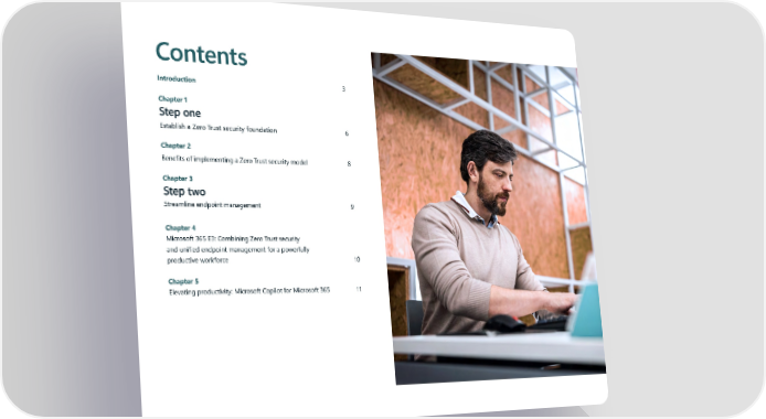 Contents Introduction 3 Chapter 1 Step one Establish a Zero Trust security foundation 6 Chapter 2 8 Benefits of implementing a Zero Trust security model Chapter 3 Step two Streamline endpoint management 9 Chapter 4 Microsoft 365 E3: Combining Zero Trust security and unified endpoint management for a powerfully productive workforce 10 Chapter 5 Elevating productivity: Microsoft Copilot for Microsoft 365 11