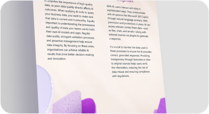 1 Strengthening data governance for AI transformation Data quality User management AI amplifies the importance of high-quality With AI, users interact with data in data, as poor data quality directly affects AI sophisticated ways. They communicate outcomes. When applying AI tools to query with AI systems like Microsoft 365 Copilot your business data, you want to make sure through natural language prompts. With that data is current and trustworthy. Equally permission and protections in place, AI can important is understanding the provenance access relevant context from data—such and quality of data your teams use to build as files, chats, and emails—along with their own AI models and apps. Regular external sources via plugins to generate data audits, stringent validation processes, a response. and proactive management help ensure data integrity. By focusing on these areas, It’s crucial to monitor the data used in organizations can achieve reliable AI these processes to ensure the AI provides results that drive better decision-making correct, grounded responses. Providing and innovation. transparency through footnotes or links to original sources helps users verify the information, reducing the risk of data misuse and ensuring compliance with regulations. 6