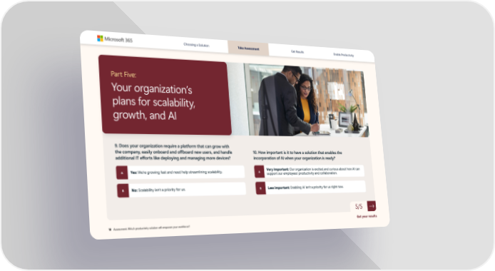 Choosing a Solution Take Assessment Get Results Enable Productivity Part Five: Your organization’s plans for scalability, growth, and AI 9. Does your organization require a platform that can grow with the company, easily onboard and offboard new users, and handle 10. How important is it to have a solution that enables the additional IT efforts like deploying and managing more devices? incorporation of AI when your organization is ready? A Yes: We’re growing fast and need help streamlining scalability. A Very important: Our organization is excited and curious about how AI can support our employees’ productivity and collaboration. B No: Scalability isn’t a priority for us. B Less important: Enabling AI isn’t a priority for us right now. 5/5 Get your results 10 Assessment: Which productivity solution will empower your workforce?