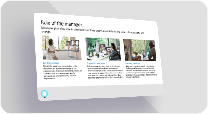 Role of the manager Managers play a key role in the success of their teams, especially during times of uncertainty and change. Lead by example Support in new ways Frequent check-ins Model the work from home habits in this Help each person create their best and most These are unusual times with unanticipated document. Be a positive example of the productive work from home environment. challenges and may require more frequent guidance, and make sure to reinforce inclusion. Understand any business continuity concerns of check-ins. Students may be out of school. Be Check in with your employees, ask for your team and support their efforts at working in sure to manage expectations, offer support, perspectives, and identify any areas for new ways. Be curious and ask questions that and take time to understand the unique needs improvement. empower employees to find their own solutions. of every employee.