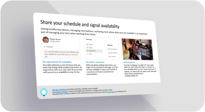 Share your schedule and signal availability Setting healthy boundaries, managing interruptions, and being clear about when you are available is an important part of managing your time when working from home. Set expectations for availability See what is important Set boundaries Your daily schedule or even the hours that you With everybody working from home, you It can be a challenge to switch ‘off’ from work work may change while working from home. Set might see an increase in messages. Use the when you don’t leave the office—or switch ‘on’ expectations with your team (and those you live settings available in Teams and Outlook to your workday when you don’t leave the house. If with) around your availability during the day. customize notifications and prioritize needed, set clear intentions about work time and conversations. home time to avoid burnout or being ‘always on’. Manage notifications for Teams activities, channels, and on mobile. Set a status message in Teams and update your calendar to indicate if you are free or busy. Set quiet hours in Teams mobile to limit notifications to your work hours and turn Focus Assist on in Windows 10.