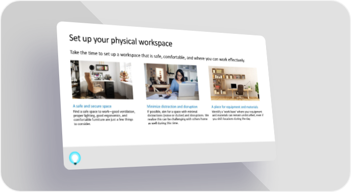 Set up your physical workspace Take the time to set up a workspace that is safe, comfortable, and where you can work effectively. A safe and secure space Minimize distraction and disruption A place for equipment and materials Find a safe space to work—good ventilation, If possible, aim for a space with minimal Identify a ‘work base’ where your equipment proper lighting, good ergonomics, and distractions (noise or clutter) and disruptions. We and materials can remain undisturbed, even if comfortable furniture are just a few things realize this can be challenging with others home you shift locations during the day. to consider. as well during this time.