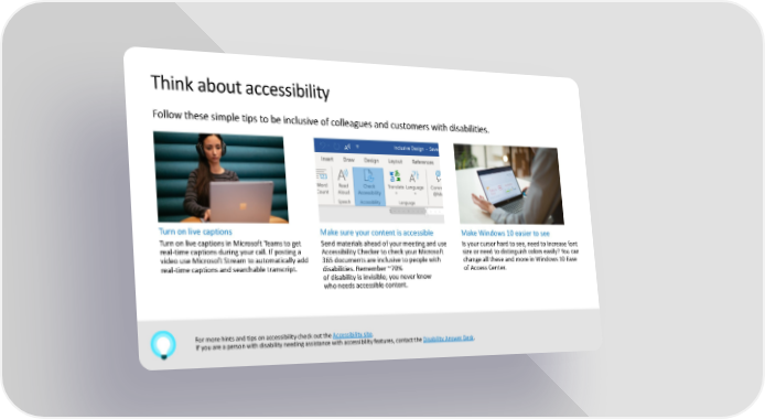 Think about accessibility Follow these simple tips to be inclusive of colleagues and customers with disabilities. Turn on live captions Make sure your content is accessible Make Windows 10 easier to see Turn on live captions in Microsoft Teams to get Send materials ahead of your meeting and use Is your cursor hard to see, need to increase font real-time captions during your call. If posting a Accessibility Checker to check your Microsoft size or need to distinguish colors easily? You can video use Microsoft Stream to automatically add 365 documents are inclusive to people with change all these and more in Windows 10 Ease real-time captions and searchable transcript. disabilities. Remember ~70% of Access Center. of disability is invisible; you never know who needs accessible content. For more hints and tips on accessibility check out the Accessibility site. If you are a person with disability needing assistance with accessibility features, contact the Disability Answer Desk.