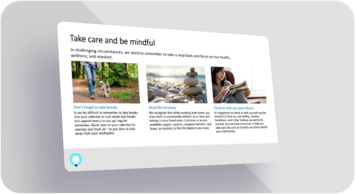 Take care and be mindful In challenging circumstances, we need to remember to take a step back and focus on our health, wellness, and mindset. Don’t forget to take breaks Work-life harmony Check-in with you (and others) It can be difficult to remember to take breaks. We recognize that while working from home you It’s important to check in with yourself and be Use your calendar to turn meals and breaks may need to occasionally redirect your time and mindful of how you are feeling. Anxiety, into appointments so you get regular energy to your loved ones. Continue to access loneliness, and other feelings are perfectly reminders. Block time on your calendar for available support options, caregiver benefits, and normal, and we have resources to help you exercise and fresh air—or just time to step leave, as needed, to find the balance you need. take care. Be sure to check in on others within away from your workspace. your community.