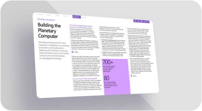 Overview Carbon Water Waste Ecosystems Appendix 61 Driving innovation AI for Earth: a global program and the of large datasets, then present those results in We have on-boarded four years of Landsat 8 data to Building the precursor to the Planetary Computer applications that support environmental monitoring, Azure, the first step in making available a complete In 2017, we launched our AI for Earth program. forecasting, planning, and attribution. Landsat archive that will enable scientists to ask Our aim was simple, but ambitious—to put cloud Since we announced our commitment to the Planetary questions about long-term ecosystem change. Planetary and AI technology into the hands of the world’s Computer, we have on-boarded over 10 petabytes of • The National Oceanic and Atmospheric Administration leading ecologists and conservation technologists, environmental science data from dozens of sources. (NOAA), which provides invaluable information about and organizations around the world that are working Some key examples include: weather and climate from a network of monitoring Computer to protect our planet. • The Sentinel-2 satellite program, which provides the stations that includes both satellites and ground-based So far, we’ve provided over 700 grants to organizations highest-resolution satellite imagery that’s available radar stations. We have on-boarded several key NOAA working on game-changing environmental innovations to the public at no cost. We have brought four years datasets to allow scientists to build a picture of We believe that Microsoft’s most in more than 100 countries around the world. Our AI for of Sentinel-2 data to Azure and processed it to an weather and climate, including weather forecast data important contribution to protecting Earth grantees authored more than 80 research papers analysis-ready format, allowing environmental from NOAA’s GFS4 system, historical estimates of as part of the program and have released over 50 GitHub scientists to ask questions about the state of land use, global precipitation from NOAA’s Global Hydro ecosystems and biodiversity is repositories to the open-source community. forests, glaciers, and other critical landscape features. Estimator program, historical surface weather delivering the Planetary Computer, conditions from NOAA’s Integrated Surface Data Find out • Landsat 8, which is the newest satellite in the Landsat program, satellite-based weather imagery from which provides access to the world’s more here program, a network of satellites that has been NOAA’s GOES-R weather satellites, and radar data critical environmental datasets, However, as we grew the program, we also learned what continuously monitoring the Earth since 1972. from NOAA’s NEXRAD program. AI, and digital technology. gaps still existed. Researchers needed much greater • Large-scale geospatial data, which is critical for access to data, more intuitive access to machine learning environmental science, but training the next tools, and a greater ability to share their work and build generation of AI-based biodiversity monitoring on the work of others. We recognized the need not only 700+ solutions requires lots of annotated wildlife monitoring to host datasets on the cloud, but also to build the data. In partnership with conservation biologists scaling infrastructure that would make it possible for the We’ve worked to empower around the world, we’ve assembled on Azure the sustainability community to work with that data: data over 700 organizations largest publicly available collection of AI-ready curation, computational platforms, the ability to train through our AI for training data for wildlife conservation including algorithms and run them at planetary scale, and the Earth program. data from motion-triggered camera traps, drones, ability to serve the results of those algorithms as satellites, and aircraft. applications available to users anywhere in the world. Find out more here Our new focus: the Planetary Computer 80 Based on these lessons learned, in 2020, we committed to building the Planetary Computer: a platform that Our AI for Earth grantees provides access to the world’s critical environmental have authored more than datasets. We will continuously on-board more data with 80 research papers as part of our customers and partners and build the tools that the program. make it easier for scientists to ask global-scale questions