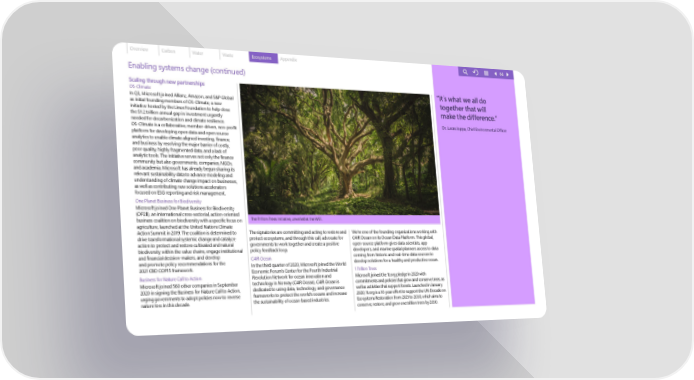 Overview Carbon Water Waste Ecosystems Appendix 66 Enabling systems change (continued) Scaling through new partnerships “ It΄s what we all do OS-Climate together that will In Q3, Microsoft joined Allianz, Amazon, and S&P Global as initial founding members of OS-Climate, a new make the difference.” initiative hosted by the Linux Foundation to help close the $1.2 trillion annual gap in investment urgently Dr. Lucas Joppa, Chief Environmental Officer needed for decarbonization and climate resilience. OS-Climate is a collaborative, member-driven, non-profit platform for developing open data and open source analytics to enable climate aligned investing, finance, and business by resolving the major barrier of costly, poor quality, highly fragmented data, and a lack of analytic tools. The initiative serves not only the finance community but also governments, companies, NGOs, and academia. Microsoft has already begun sharing its relevant sustainability data to advance modeling and understanding of climate change impact on businesses, as well as contributing new solutions accelerators focused on ESG reporting and risk management. One Planet Business for Biodiversity Microsoft joined One Planet Business for Biodiversity (OP2B), an international cross-sectorial, action-oriented business coalition on biodiversity with a specific focus on The Trillion Trees Initiative, unveiled at the WEF. agriculture, launched at the United Nations Climate Action Summit in 2019. The coalition is determined to The signatories are committing and acting to restore and We’re one of the founding organizations working with drive transformational systemic change and catalyze protect ecosystems, and through this call, advocate for C4IR Ocean on its Ocean Data Platform. This global, action to protect and restore cultivated and natural governments to work together and create a positive open-source platform gives data scientists, app biodiversity within the value chains, engage institutional policy feedback loop. developers, and marine spatial planners access to data and financial decision-makers, and develop C4IR Ocean coming from historic and real-time data sources to and promote policy recommendations for the In the third quarter of 2020, Microsoft joined the World develop solutions for a healthy and productive ocean. 2021 CBD COP15 framework. Economic Forum’s Center for the Fourth Industrial 1 Trillion Trees Business for Nature Call to Action Revolution Network for ocean innovation and Microsoft joined the 1t.org pledge in 2020 with Microsoft joined 560 other companies in September technology in Norway (C4IR Ocean). C4IR Ocean is commitments and policies that grow and conserve trees, as 2020 in signing the Business for Nature Call to Action, dedicated to using data, technology, and governance well as activities that support forests. Launched in January urging governments to adopt policies now to reverse frameworks to protect the world’s oceans and increase 2020, 1t.org is a 10-year effort to support the UN Decade on nature loss in this decade. the sustainability of ocean-based industries. Ecosystems Restoration from 2021 to 2030, which aims to conserve, restore, and grow one trillion trees by 2030.