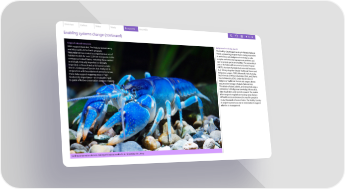 Overview Carbon Water Waste Ecosystems Appendix 64 Enabling systems change (continued) Indigenous knowledge plus AI Maps of natural resources The Healthy Country partnership in Kakadu National With support from Esri, The Nature Conservancy, Park is a pioneering program that is mixing responsible and Microsoft΄s AI for Earth program, AI and science with Indigenous knowledge to solve NatureServe has created a comprehensive set of complex environmental management problems and habitat models for over 2,200 at-risk species in the care for animal species and habitats. The partnership is contiguous United States, including those ranked part of the National Environmental Science Program as Globally Critically Imperiled or Globally (NESP)΄s Northern Australia Environmental Resources Imperiled, or those listed as full species under Hub. It brings together Kakadu Traditional Owners and the U.S. Endangered Species Act. Analyzed in indigenous rangers, CSIRO, Microsoft, Parks Australia, conjunction with boundaries of protected areas, the University of Western Australia (UWA), and Charles these data support mapping areas of high Darwin University (CDU). Under the direction of biodiversity importance—an invaluable input Indigenous Traditional Owners and rangers, drones to guide effective conservation decision-making. capture video footage in Kakadu National Park. The data is collected, labeled, and interpreted using a combination of Indigenous knowledge, Microsoft AI, data visualization, and scientific research. The models allow rangers to regularly survey large areas that are difficult to access and remove the need for people to review thousands of hours of video. The Healthy Country AI project represents an end-to-end solution to support adaptive co-management. Guiding conservation decision-making with habitat models for at-risk species. Chris Lukhaup