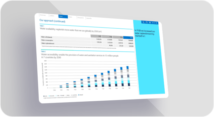 Overview Carbon Water Waste Ecosystems Appendix 34 Our approach (continued) Table 1 In FY20 we increased our Water availability: replenish more water than we use globally by 2030 (m³) water replenishment by 3 1,621,629 m . FY17 FY18 FY19 FY20 Water withdrawals 5,148,454 6,718,985 7,505,081 7,618,089 Water consumption 1,912,934 3,325,664 3,945,783 3,966,639 Water replenishment¹ 96,906 235,380 1,621,629 ¹ Reported volumes represent total incremental contracted water replenishment projects for each fiscal year. Reported volumes may be adjusted once individual water replenishment projects are completed and volumes verified. Table 2 Water accessibility: enable the provision of water and sanitation services to 1.5 million people in 7 countries by 2030 1,800 1,600 1,400 1,200 1,000 800 600 400 Population provided water access (thousands)200 0 FY20 FY21 FY22 FY23 FY24 FY25 FY26 FY27 FY28 FY29 FY30 FY31 India Indonesia China Brazil Mexico South Africa Malaysia Straight line projections are subject to change as water accessibility projects are implemented.