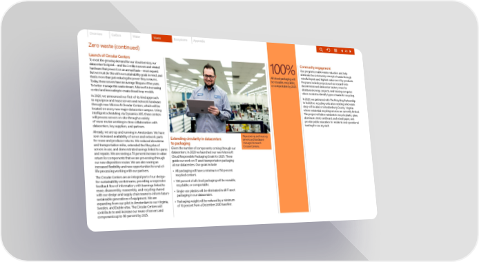 Overview Carbon Water Waste Ecosystems Appendix 49 Zero waste (continued) Launch of Circular Centers Community engagement To meet the growing demand for our cloud services, our 100% Our programs enable waste reduction and help datacenter footprint—and the 3 million servers and related eliminate the community concept of waste through hardware that power it on an annual basis—must expand. All cloud packaging will mindful inputs and highest-value use of by-products. But we must do this with our sustainability goals in mind, and be reusable, recyclable, Programs include projects such as research into that is more than just reducing the power they consume. or compostable by 2025. decommissioned datacenter battery reuse for Today, these servers have an average lifespan of five years. distributed energy projects, and training computer To better manage this waste stream, Microsoft is increasing vision models to identify types of waste for recycling. control and innovating to create closed loop models. In 2020, we partnered with The Recycling Partnership In 2020, we announced our first-of-its kind approach to build two recycling units at an existing solid waste to repurpose and reuse servers and network hardware drop-off location in Mecklenburg County, Virginia through new Microsoft Circular Centers, which will be where residential recycling services are currently limited. located on every new major datacenter campus. Using This project will allow residents to recycle plastic, glass, intelligent scheduling via Dynamics 365, these centers aluminum, steel, cardboard, and mixed paper, and will process servers on-site through a variety provide public education for residents and operational of reuse routes working in close collaboration with training for county staff. datacenters, key suppliers, and partners. Already, we are up and running in Amsterdam. We have Repurposing and reusing seen increased availability of server and network parts Extending circularity in datacenters servers and hardware for reuse and producer returns. We reduced downtime to packaging through Microsoft and transportation miles, extended the lifecycles of Given the number of components coming through our Circular Centers. servers in use, and demonstrated savings linked to spares datacenters, in 2020 we launched our new Microsoft and repairs. We are seeing a 70 percent increase in value Cloud Responsible Packaging Goals for 2025. These return for components that we are processing through guide our work on IT asset transportation packaging our new disposition routes. We are also seeing an at our datacenters. Our goals include: increased flexibility and new opportunities for end-of- life processing working with our partners. • All packaging will have a minimum of 50 percent The Circular Centers are an integral part of our design- recycled content. for-sustainability workstreams, providing a responsive • 100 percent of all cloud packaging will be reusable, feedback flow of information, with learnings linked to recyclable, or compostable. reuse, disassembly, reassembly, and recycling shared • Single-use plastics will be eliminated in all IT asset with our design and supply chain teams to inform future packaging in our datacenters. sustainable generations of equipment. We are expanding from our pilot in Amsterdam to our Virginia, • Packaging weight will be reduced by a minimum Sweden, and Dublin sites. The Circular Centers will of 10 percent from a December 2020 baseline. contribute to and increase our reuse of servers and components up to 90 percent by 2025.