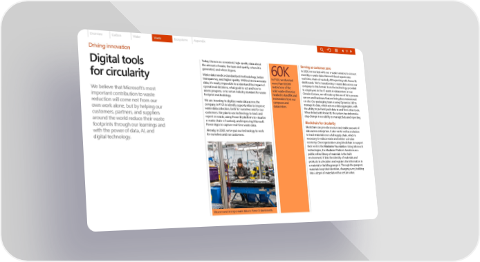 Overview Carbon Water Waste Ecosystems Appendix 51 Driving innovation Today, there is no consistent, high-quality data about Serving as customer zero Digital tools the amount of waste, the type and quality, where it is In 2020, we worked with our e-waste vendors to convert generated, and where it goes. 60K monthly e-waste data Microsoft Excel reports into Waste data needs a standardized methodology, better In FY20, we diverted real-time, chain-of-custody API reporting with Power BI for circularity transparency, and higher quality. Without more accurate more than 60,000 dashboards. We’re transitioning e-waste data across our data, it’s nearly impossible to understand the impact of metric tons of the company to this format, from the technology provided operational decisions, what goals to set and how to solid waste otherwise to employees to the IT assets in datacenters. In our We believe that Microsoft’s most assess progress, or to set an industry standard for waste headed to landfills and Circular Centers, we will scale up the use of AI to process important contribution to waste footprint methodology. incineration from our servers and hardware that are being decommissioned We are investing to digitize waste data across the campuses and on-site. Our packaging team is using Dynamics 365 to reduction will come not from our company in FY21 to identify opportunities to improve datacenters. manage its data, which acts as a data aggregator, with own work alone, but by helping our waste data collection, both for ourselves and for our the ability to pull and push data to and from other tools. customers. We plan to use technology to track and When linked with Power BI, the system has delivered a customers, partners, and suppliers report on waste, using Power BI platforms to visualize step change in our ability to manage data and reporting. around the world reduce their waste e-waste chain-of-custody, and improving Microsoft Blockchain for circularity footprints through our learnings and Power Apps to capture real-time waste data. Blockchain can provide a secure and stable account of with the power of data, AI, and Already, in 2020, we΄ve put our technology to work data across enterprises. It also works well as a solution for ourselves and our customers. to track materials over a full supply chain, which is digital technology. necessary to reduce waste and bolster a circular economy. One organization using blockchain to support their work is the Madaster Foundation. Using Microsoft technologies, the Madaster Platform functions as a public online library of materials in the built environment. It links the identity of materials and products to a location and registers the information in a material or building passport. Through the passport, materials keep their identities, changing every building into a depot of materials with a certain value. We are transitioning e-waste data to Power BI dashboards.
