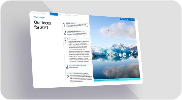 Overview Carbon Water Waste Ecosystems Appendix 43 What΄s next? Sourcing replenishment projects that drive Our focus 1 collective action and have transformative impact for 2021 in our priority locations. Enabling drinking water and/or sanitation 2access for 140,000 people by the end of FY21 through our partnership with Water.org. Creating new tools: 3• Hosting the next generation of global climate projections so that the World Resources Institute and its partners can generate future water projections, thereby enabling water- climate scenario analysis and enhancing understanding of future water risks. • Supporting the development of an enterprise- scale water stewardship self-assessment tool in partnership with the CEO Water Mandate. • Working with our partners to build new tools or accelerate the deployment of existing tools, such as BasinScout Platform, to empower our customers to achieve their water goals. Improving the usefulness of our water 4consumption data. Using our Emerald Technology Ventures 5investment to identify technology adoption opportunities for emerging water technologies from our Climate Innovation Fund that can help Microsoft achieve our water positive commitment and support our customers. Identifying adoption opportunities for emerging water technologies.