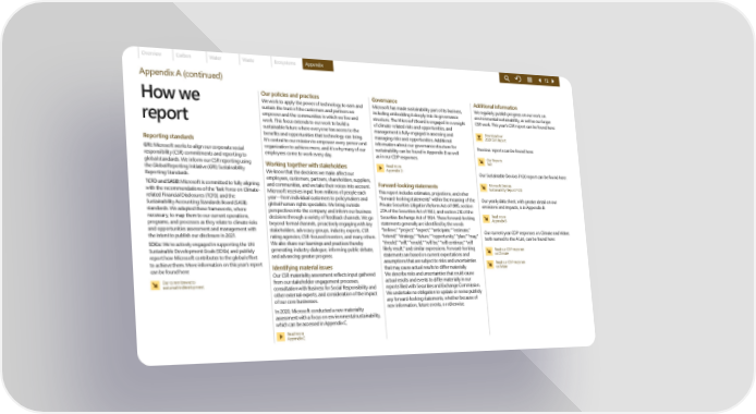 Overview Carbon Water Waste Ecosystems Appendix 72 Appendix A (continued) Our policies and practices Governance Additional information How we We work to apply the power of technology to earn and Microsoft has made sustainability part of its business, We regularly publish progress on our work on sustain the trust of the customers and partners we including embedding it deeply into its governance environmental sustainability, as well as our larger empower and the communities in which we live and structure. The Microsoft Board is engaged in oversight CSR work. This year’s CSR report can be found here: report work. This focus extends to our work to build a of climate-related risks and opportunities, and sustainable future where everyone has access to the management is fully engaged in assessing and Download our benefits and opportunities that technology can bring. managing risks and opportunities. Additional 2020 CSR Report Reporting standards It’s central to our mission to empower every person and information about our governance structure for Previous reports can be found here: GRI: Microsoft works to align our corporate social organization to achieve more, and it΄s why many of our sustainability can be found in Appendix D as well responsibility (CSR) commitments and reporting to employees come to work every day. as in our CDP responses. Our Reports hub global standards. We inform our CSR reporting using Working together with stakeholders Read more the Global Reporting Initiative (GRI) Sustainability We know that the decisions we make affect our Appendix D Our Sustainable Devices FY20 report can be found here: Reporting Standards. employees, customers, partners, shareholders, suppliers, TCFD and SASB: Microsoft is committed to fully aligning and communities, and we take their voices into account. Forward-looking statements Microsoft Devices Sustainability Report FY20 with the recommendations of the Task Force on Climate- Microsoft receives input from millions of people each This report includes estimates, projections, and other related Financial Disclosures (TCFD) and the year—from individual customers to policymakers and “forward-looking statements” within the meaning of the Our yearly data sheet, with greater detail on our Sustainability Accounting Standards Board (SASB) global human rights specialists. We bring outside Private Securities Litigation Reform Act of 1995, section emissions and impacts, is in Appendix B: standards. We adapted these frameworks, where perspectives into the company and inform our business 27A of the Securities Act of 1933, and section 21E of the necessary, to map them to our current operations, decisions through a variety of feedback channels. We go Securities Exchange Act of 1934. These forward-looking Read more programs, and processes as they relate to climate risks beyond formal channels, proactively engaging with key statements generally are identified by the words Appendix B and opportunities assessment and management with stakeholders, advocacy groups, industry experts, CSR “believe,” “project,” “expect,” “anticipate,” “estimate,” Our current year CDP responses on Climate and Water, the intent to publish our disclosure in 2021. rating agencies, CSR-focused investors, and many others. “intend,” “strategy,” “future,” “opportunity,” “plan,” “may,” both named to the A List, can be found here: SDGs: We΄re actively engaged in supporting the UN We also share our learnings and practices thereby “should,” “will,” “would,” “will be,” “will continue,” “will Sustainable Development Goals (SDGs) and publicly generating industry dialogue, informing public debate, likely result,” and similar expressions. Forward-looking Read our CDP response report how Microsoft contributes to the global effort and advancing greater progress. statements are based on current expectations and on Climate to achieve them. More information on this year’s report assumptions that are subject to risks and uncertainties Read our CDP response can be found here: Identifying material issues that may cause actual results to differ materially. on Water Our CSR materiality assessment reflects input gathered We describe risks and uncertainties that could cause Our commitment to from our stakeholder engagement processes, actual results and events to differ materially in our sustainable development consultation with Business for Social Responsibility and reports filed with Securities and Exchange Commission. other external experts, and consideration of the impact We undertake no obligation to update or revise publicly of our core businesses. any forward-looking statements, whether because of In 2020, Microsoft conducted a new materiality new information, future events, or otherwise. assessment with a focus on environmental sustainability, which can be accessed in Appendix C. Read more Appendix C
