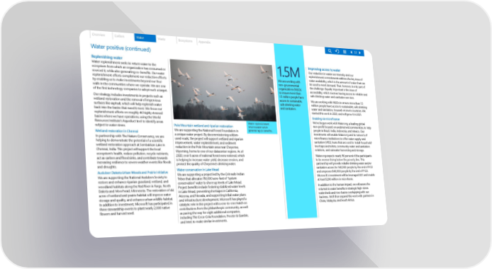 Overview Carbon Water Waste Ecosystems Appendix 37 Water positive (continued) Replenishing water Improving access to water Water replenishment seeks to return water to the Our reduction in water use intensity and our ecosystem from which an organization has consumed or 1.5M replenishment commitments address the key issue of sourced it, while also generating co-benefits. Our water We are working with water availability, which is the amount of water that can replenishment efforts complement our reduction efforts non-governmental be used to meet demand. That, however, is only part of by enabling us to make investments beyond our four organizations (NGOs) the challenge. Equally important is the issue of walls in the communities where we operate. We are one to ensure more than accessibility, which involves having access to reliable and of the first technology companies to adopt such a target. 1.5 million people have safe drinking water and sanitation services. Our strategy includes investments in projects such as access to sustainable, We are working with NGOs to ensure more than 1.5 wetland restoration and the removal of impervious safe drinking water million people have access to sustainable, safe drinking surfaces like asphalt, which will help replenish water and sanitation. water and sanitation, focused on seven countries. We back into the basins that need it most. We focus our started this work in 2020, and will grow it in 2021. replenishment efforts on roughly 40 highly stressed Enabling via microfinance basins where we have operations, using the World We’ve begun work with Water.org, a leading global Resources Institute’s Aqueduct tool to identify areas Water replenishment non-profit focused on underserved communities, to help subject to water stress. Pole Mountain wetland and riparian restoration returns water while people in Brazil, India, Indonesia, and Mexico. Our Wetland restoration in Chennai We are supporting the National Forest Foundation in generating co-benefits. a unique water project. By decommissioning seldom- investments will enable Water.org and its network of In partnership with The Nature Conservancy, we are used roads, the project will support wetland and riparian microfinance institutions to offer water supply and helping to demonstrate the potential of a scientific improvement, water replenishment, and sediment sanitation (WSS) loans that are used to install household- wetland restoration approach at Sembakkan Lake in reduction in the Pole Mountain area near Cheyenne, level taps and toilets, community water and sanitation Chennai, India. This project will support the local Wyoming, home to one of our datacenter regions. As of solutions, and rainwater harvesting and storage. ecosystem’s health, reduce pollution, recycle nutrients, 2020, over 6 acres of national forest were restored, which Water.org expects nearly 90 percent of the participants act as carbon and flood sinks, and contribute towards is helping to increase water yield, decrease erosion, and to be women living below the poverty line. This increasing resilience to severe weather events like floods protect the quality of Cheyenne’s drinking water. partnership will provide reliable drinking water and/or and droughts. sanitation access for 140,000 people by the end of FY21 Audubon Dakota Urban Woods and Prairie Initiative Water conservation in Lake Mead and empower 840,000 people by the end of FY23. We are supporting the National Audubon Society to We are supporting a project led by the Colorado Indian Microsoft΄s investment will be leveraged 68:1 and enable restore and enhance riparian grassland, wetland, and Tribes that allocates 150,000 acre-feet of “system at least $200 million in microloans. woodland habitats along the Red River in Fargo, North conservation” water to shore up levels of Lake Mead. Dakota and Moorhead, Minnesota. The restoration of 44 Project benefits include fostering stabilized water levels In addition to the human impact, we will assess the acres of wetland and prairie habitat will improve water in Lake Mead, preventing shortages in California, volumetric water benefits in strategic high-stress storage and quality, and enhance urban wildlife habitat. Arizona, and Nevada, and supporting tribal water plans watersheds and river basins overlapping with our In addition to investment, Microsoft has participated in and infrastructure development. Microsoft has played a business. We’ll then expand this work with partners in three stewardship events to plant nearly 2,000 native catalytic role in this project with a one-to-one match on China, Malaysia, and South Africa. flowers and harvest seed. contributions from the philanthropic community, as well as paving the way for eight additional companies, including The Coca-Cola Foundation, Procter & Gamble, and Intel, to make similar investments.