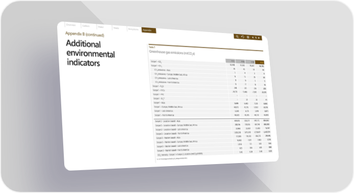 Overview Carbon Water Waste Ecosystems Appendix 76 Appendix B (continued) Additional Table 7 Greenhouse gas emissions (mtCO e) 2 environmental FY17 FY18 FY19 FY20 Scope 1 – CO 82,448 81,263 95,667 96,700 2 indicators Scope 1 – CH4 45 45 50 53 CH emissions – Asia 5 4 3 4 4 CH emissions – Europe, Middle East, Africa 16 15 26 28 4 CH emissions – Latin America 9 9 5 5 4 CH emissions – North America 16 17 16 16 4 Scope 1 – N O 248 261 256 236 2 Scope 1 – HFCs 24,710 17,408 21,951 21,070 Scope 1 – PFC – – – – Scope 1 – SF 13 – 32 32 41 6 Scope 1 – Asia 9,699 6,483 7,330 8,650 Scope 1 – Europe, Middle East, Africa 44,873 41,276 57,957 61,719 Scope 1 – Latin America 6,260 6,173 3,919 3,871 Scope 1 – North America 46,620 45,076 48,750 43,859 Scope 2 – Location-based – Asia 439,035 528,277 691,772 804,567 Scope 2 – Location-based – Europe, Middle East, Africa 399,194 519,058 681,743 860,858 Scope 2 – Location-based – Latin America 20,968 23,450 25,403 15,707 Scope 2 – Location-based – North America 1,838,358 1,875,258 2,158,601 2,421,314 Scope 2 – Market-based – Asia 121,930 174,533 266,725 219,416 Scope 2 – Market-based – Europe, Middle East, Africa 14,460 7,301 7,463 7,376 Scope 2 – Market-based – Latin America 2,053 751 632 594 Scope 2 – Market-based – North America 623 744 600 808 CO Intensity – Scope 1 + Scope 2, Location (mtCO e/MWh) 0.42 0.39 0.40 0.39 2 2 13 In FY18 we began estimating SF leakage at datacenters. ₆