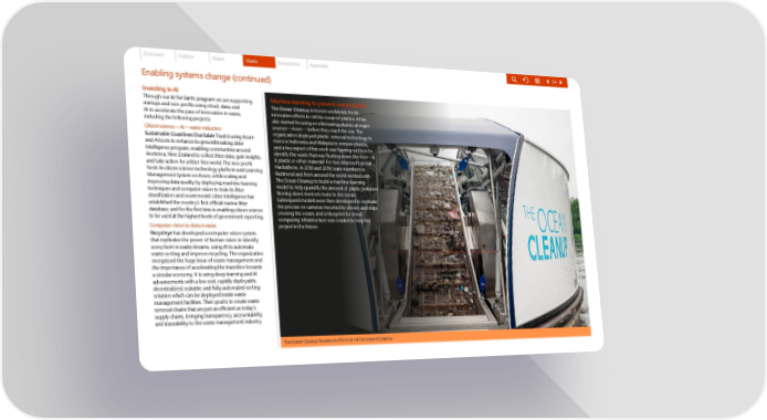 Overview Carbon Water Waste Ecosystems Appendix 54 Enabling systems change (continued) Investing in AI Machine learning to prevent ocean plastics Through our AI for Earth program we are supporting startups and non-profits using cloud, data, and The Ocean Cleanup is known worldwide for its AI to accelerate the pace of innovation in waste, innovative efforts to rid the ocean of plastics. It has including the following projects: also started focusing on eliminating plastics at major Citizen science + AI = waste reduction sources—rivers— before they reach the sea. The Sustainable Coastlines Charitable Trust is using Azure organization deployed plastic-removal technology in and AI tools to enhance its groundbreaking Litter rivers in Indonesia and Malaysia to remove plastics, Intelligence program, enabling communities around and a key aspect of this work was figuring out how to Aoeteroa, New Zealand to collect litter data, gain insights, identify the waste that was floating down the river—is and take action for a litter-free world. The non-profit it plastic or other material? For two Microsoft global hosts its citizen science technology platform and Learning Hackathons, in 2018 and 2019, team members in Management System on Azure, while scaling and Redmond and from around the world worked with improving data quality by deploying machine learning The Ocean Cleanup to build a machine learning techniques and computer vision to train its litter model to help quantify the amount of plastic pollution classification and count model. Litter Intelligence has flowing down rivers en route to the ocean. established the country΄s first official marine litter Subsequent models were then developed to replicate database, and for the first time is enabling citizen science the process on cameras mounted to drones and ships to be used at the highest levels of government reporting. crossing the ocean, and a blueprint for cloud computing infrastructure was created to help the Computer vision to detect waste project in the future. Recycleye has developed a computer vision system that replicates the power of human vision to identify every item in waste streams, using AI to automate waste sorting and improve recycling. The organization recognized the huge issue of waste management and the importance of accelerating the transition towards a circular economy. It is using deep learning and AI advancements with a low cost, rapidly deployable, decentralized, scalable, and fully automated sorting solution which can be deployed inside waste management facilities. Their goal is to create waste removal chains that are just as efficient as today΄s supply chains, bringing transparency, accountability, and traceability to the waste management industry. The Ocean Cleanup focuses on efforts to rid the ocean of plastics.