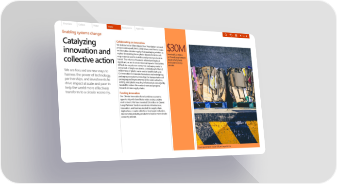 Overview Carbon Water Waste Ecosystems Appendix 53 Enabling systems change Collaborating on innovation Catalyzing We kickstarted an Ellen MacArthur Foundation network project with Aquafil, BASF, CHEP, Cisco, and Flex to create $30M an alternative circular supply chain packaging solution to Invested $30 million innovation and replace the existing linear plastic-based shrink/stretch in Closed Loop Partners' wrap material used to stabilize and protect products in funds to help build transit. The volume of business-related packaging is a circular economy collective action significant, as are its environmental impacts. Most of the at scale. difficult-to-recycle non-consumer packaging waste is comprised of single-use plastic, contributing to the 6.8 We are focused on new ways to million tons of plastic waste sent to landfill each year. harness the power of technology, Co-innovation in material alternatives and redesigning packaging ecosystems, including the transportation of partnerships, and investments to packaging and improvements in the wider collection, drive impact at scale and pace to sorting, and plastic recycling infrastructure, are urgently needed to reduce this waste stream and progress help the world more effectively towards circular supply chains. transform to a circular economy. Funding innovation Our Climate Innovation Fund combines economic opportunity with benefits to wider society and the environment. We have invested $30 million in Closed Loop Partners΄ funds to accelerate infrastructure, innovation, and business models for supply chain digitization, e-waste collection, food waste reduction, and recycling industry products to build a more circular economy at scale. Creating alternative circular B2B packing solutions.