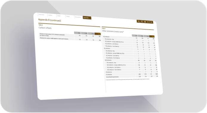 Overview Carbon Water Waste Ecosystems Appendix 77 Appendix B (continued) Table 8 Table 9 14 Carbon offsets Other emissions (metric tons) FY17 FY18 FY19 FY20 FY17 FY18 FY19 FY20 Percent of total scope 3 GHG emissions balanced 3% 3% 3% 2% NO emissions 223 209 215 202 by carbon offsets x NO emissions – Asia 13 6 7 7 Potential for carbon trade based on recent performance No No No No x NO emissions – Europe, Middle East, Africa 152 145 144 137 x NO emissions – Latin America 25 24 16 16 x NO emissions – North America 33 34 49 41 x SO emissions 13 13 12 12 x SO emissions – Asia 2 1 1 1 x SO emissions – Europe, Middle East, Africa 7 7 7 7 x SO emissions – Latin America 1 1 1 1 x SO emissions – North America 3 3 4 4 x VOC emissions 199 184 185 170 VOC emissions – Asia 10 3 5 5 VOC emissions – Europe, Middle East, Africa 148 141 133 124 VOC emissions – Latin America 24 23 15 16 VOC emissions – North America 17 16 32 26 PM emissions 7 7 8 8 CO emissions 1,860 1,704 1,721 1,584 Ozone depleting substances 1,330 1,116 579 415 14 Values have been adjusted to include methodology improvements and structural changes, which have been applied to all years reported in this factsheet.