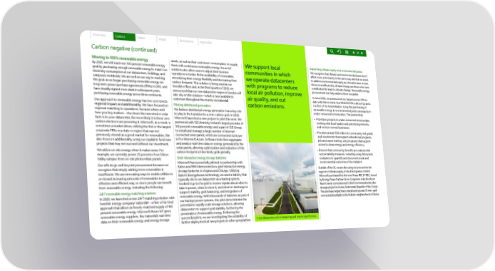 Overview Carbon Water Waste Ecosystems Appendix 18 Carbon negative (continued) Moving to 100% renewable energy assets, as well as their customers’ consumption, to supply We support local Supporting climate equity and environmental justice By 2025, we will reach our 100 percent renewable energy them with continuous renewable energy. Azure IoT We recognize that climate and environmental issues don’t goal by purchasing enough renewable energy to match our solutions also allow users to adjust their business communities in which affect every community in the same way and that we need electricity consumption at our datacenters, buildings, and operations to better fit the availability of renewables, we operate datacenters to address environmental equity as a broader issue. In fact, campuses worldwide. We are well on our way to reaching monetizing their energy flexibility and decreasing their those most affected by climate change are those who have this goal, as we began purchasing renewable energy via carbon footprint. This solution is being used at our with programs to reduce contributed the least to climate change. Renewable energy long-term power purchase agreements (PPAs) in 2013, and Swedish offices and, in the third quarter of 2020, we local air pollution, improve procurement can help address these inequities. have steadily signed more deals in subsequent years, announced that our new datacenter region in Sweden will In June 2020, we announced our largest power PPA to purchasing renewable energy across three continents. also rely on the solution—which is now available to air quality, and cut date with this in mind. Our 500MW PPA with Sol Systems Our approach to renewable energy has two core tenets: customers throughout the country via Vattenfall. carbon emissions. is a first-of-its-kind initiative, tying the purchasing of regional impact and additionality. We have focused on Piloting distributed generation renewable energy to environmental justice and equity in regional matching to operations, because where and We believe distributed energy generation has a key role under-resourced communities. This partnership: how you buy matters—the closer the new wind or solar to play in the transition to a zero-carbon grid. In 2020, • Prioritizes projects in under-resourced communities, farm is to your datacenter, the more likely it is those zero Microsoft launched a new project to pilot this work. We working with local leaders and prioritizing minority carbon electrons are powering it. Microsoft, as a result, is partnered with SSE Airtricity, Ireland’s largest provider of and women-owned businesses. sometimes a market driver, striking the first or the largest 100 percent renewable energy and a part of SSE Group, corporate PPAs in a state or region that was not to install and manage a large number of internet- • Provides at least $50 million for community-led grants previously viewed as a good market for renewables. We connected solar panels, which are connected via Azure and investments that support educational programs, also focus on additionality, using our capital to fund new IoT to Microsoft Azure. Software tools then aggregate job and career training, and programs that support projects that may not succeed without our investment. and analyze real-time data on energy generated by the access to clean energy and energy efficiency. We utilize on-site energy when it makes sense. For solar panels, allowing optimization and reduction of the • Ensures that community benefits are realized with example, we currently power 25 percent of our Silicon carbon footprint of electricity grids globally. accountability measures, including using third-party Valley campus from on-site photovoltaic panels. Grid-interactive energy storage batteries evaluators to quantify and document social and Our efforts go well beyond procurement because we Microsoft has successfully piloted, in partnership with environmental outcomes of the initiative. recognize that simply adding more renewables is Eaton and PJM Interconnection, grid-interactive energy Outside of the US, we are also using our procurement in insufficient. We are innovating ways to enable utilities to storage batteries in Virginia and Chicago. Utilizing support of climate equity. In the third quarter of 2020, on-board increasing amounts of renewables in an Eaton’s EnergyAware technology, we used a battery that Microsoft purchased the first-ever Peace REC (P-REC), issued effective and efficient way, so more people can benefit typically sits in our datacenter as a backup system, by Energy Peace Partners from Congolese solar developer from renewable energy, including the following: hooked it up to the grid to receive signals about when to Nuru’s newly commissioned 1.3MW commercial solar-plus- take in power, when to store it, and when to discharge to storage project in Goma, Democratic Republic of the Congo. 24/7 renewable energy matching solutions support stability, grid balancing, and integration of The purchase helped Nuru install and operate 35 mini-grid- In 2020, we launched a new 24/7 matching solution with renewable energy. With thousands of batteries as part of connected streetlights in the Ndosho neighborhood of Goma. Swedish energy company Vattenfall—a first-of-its-kind our backup power systems, this pilot demonstrates the approach that allows an hourly-matched supply of 100 potential to rapidly scale storage solutions, allowing percent renewable energy. Microsoft Azure IoT gives datacenters to support grid stability, furthering the renewable energy suppliers, like Vattenfall, real-time penetration of renewable energy. Following the data on their renewable energy and energy storage successful pilots, we are investigating the suitability of In our datacenters, we’re measuring and improving efficiency. further deployment at new projects in other geographies.