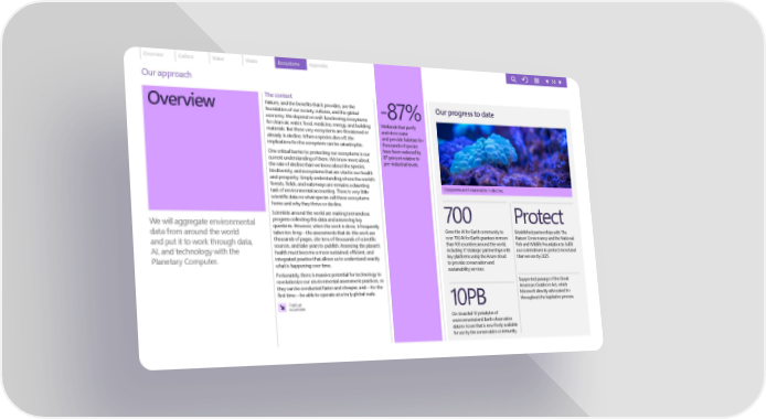 Overview Carbon Water Waste Ecosystems Appendix 58 Our approach The context Overview Nature, and the benefits that it provides, are the Our progress to date foundation of our society, cultures, and the global -87% economy. We depend on well-functioning ecosystems for clean air, water, food, medicine, energy, and building Wetlands that purify materials. But these very ecosystems are threatened or and store water already in decline. When a species dies off, the and provide habitats for implications for the ecosystem can be catastrophic. thousands of species One critical barrier to protecting our ecosystems is our have been reduced by current understanding of them. We know more about 87 percent relative to the rate of decline than we know about the species, pre-industrial levels. biodiversity, and ecosystems that are vital to our health and prosperity. Simply understanding where the world’s forests, fields, and waterways are remains a daunting Ecosystems are threatened or in decline. task of environmental accounting. There is very little scientific data on what species call those ecosystems home and why they thrive or decline. Scientists around the world are making tremendous We will aggregate environmental progress collecting this data and answering key 700 Protect questions. However, when the work is done, it frequently Grew the AI for Earth community to Established partnerships with The data from around the world takes too long—the assessments that do this work are over 700 AI for Earth grantees in more Nature Conservancy and the National and put it to work through data, thousands of pages, cite tens of thousands of scientific than 100 countries around the world, Fish and Wildlife Foundation to fulfill AI, and technology with the sources, and take years to publish. Assessing the planet’s including 17 strategic partnerships with our commitment to protect more land health must become a more sustained, efficient, and key platforms using the Azure cloud than we use by 2025. Planetary Computer. integrated practice that allows us to understand exactly to provide conservation and what is happening over time. sustainability services. Fortunately, there is massive potential for technology to revolutionize our environmental assessment practices, so Supported passage of the Great they can be conducted faster and cheaper, and—for the American Outdoors Act, which first time—be able to operate at a truly global scale. Microsoft directly advocated for Find out 10PB throughout the legislative process. more here On-boarded 10 petabytes of environmental and Earth observation data to Azure that is now freely available for use by the conservation community.