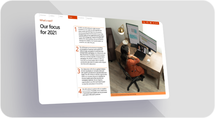 Overview Carbon Water Waste Ecosystems Appendix 56 What΄s next? In 2021, we will continue to make progress Our focus 1 towards our zero waste by 2030 agenda and share results and learnings from our journey. One key area that we are focused on now is the for 2021 transformation of our waste accounting using a mix of technology and “boots on the ground“ tactics, like waste auditing. We look forward to sharing more details of our transformation, as customer zero, later this year. We will deepen our involvement in building 2an ecosystem of partners and suppliers to reduce single-use plastics in consumer and transportation packaging. Our critical work with Ellen MacArthur Foundation network members will focus on shrink wrap/film in transportation packaging. We will also continue to scale our work with our cloud supply chain to quantify and identify alternatives to plastic waste shipped into Microsoft’s datacenters. Our datacenters will roll out a global initiative 3to train employees on company-wide and site-specific procedures to operationalize zero waste. We will continue to identify opportunities within our consumer devices to transition to circular models and utilize recycled and renewable materials. We are mapping opportunities to an effort and impact graph to chart the next phases of our journey. We will continue to partner with our suppliers 4to run a series of feasibility tests to determine if recovered ocean plastics can be processed and used in Microsoft products. We are transforming waste accounting using technology.