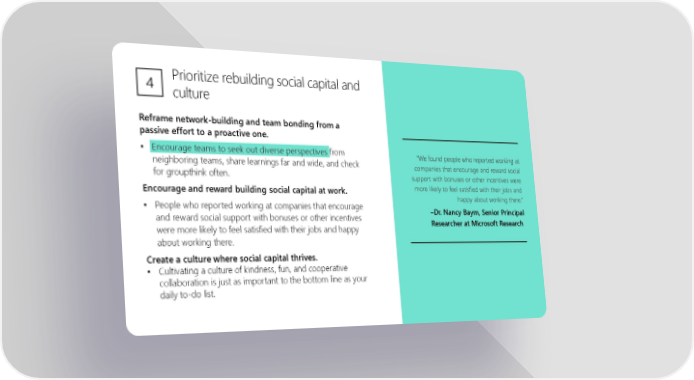Prioritize rebuilding social capital and culture 4 Reframe network - building and team bonding from a passive effort to a proactive one. • Encourage teams to seek out diverse perspectives from neighboring teams, share learnings far and wide, and check for groupthink often. E ncourage and reward building social capital at work. • People who reported working at companies that encourage and reward social support with bonuses or other incentives were more likely to feel satisfied with their jobs and happy about working there. C reate a culture where social capital thrives. • Cultivating a culture of kindness, fun, and cooperative collaboration is just as important to the bottom line as your daily to - do list. “We found people who reported working at companies that encourage and reward social support with bonuses or other incentives were more likely to feel satisfied with their jobs and happy about working there.” – Dr. Nancy Baym , Senior Principal Researcher at Microsoft Research