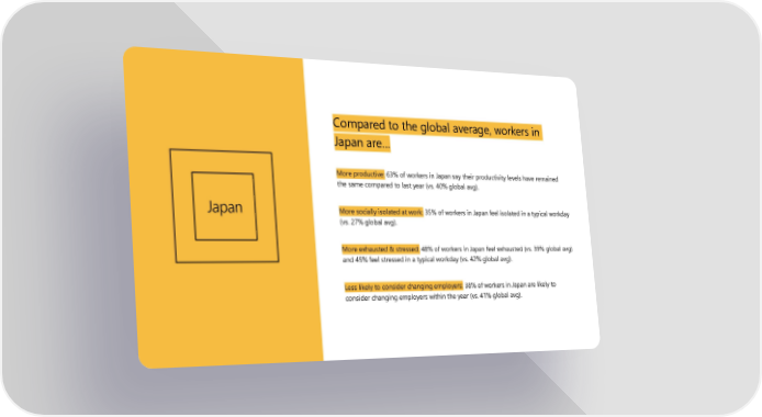 Compared to the global average, workers in Japan are... More productive: 63% of workers in Japan say their productivity levels have remained the same compared to last year (vs. 40% global avg). More socially isolated at work: 35% of workers in Japan feel isolated in a typical workday (vs. 27% global avg). More exhausted & stressed: 48% of workers in Japan feel exhausted (vs. 39% global avg) and 45% feel stressed in a typical workday (vs. 42% global avg). Less likely to consider changing employers: 38% of workers in Japan are likely to consider changing employers within the year (vs. 41% global avg). Japan