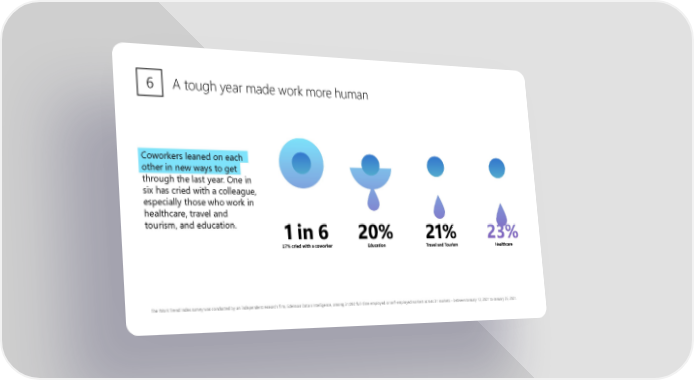 A tough year made work more human 6 Coworkers leaned on each other in new ways to get through the last year. One in six has cried with a colleague, especially those who work in healthcare, travel and tourism, and education. The Work Trend Index survey was conducted by an independent research firm, Edelman Data x Intelligence, among 31,092 full - time e mployed or self - employed workers across 31 markets – between January 12, 2021 to January 25, 2021.