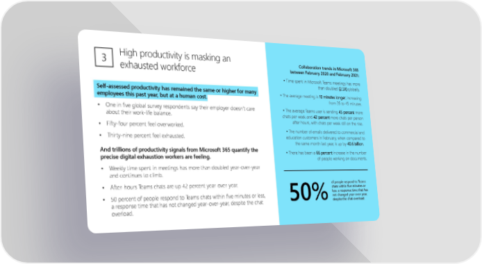 High productivity is masking an exhausted workforce 3 Collaboration trends in Microsoft 365 between February 2020 and February 2021: • Time spent in Microsoft Teams meetings has more than doubled (2.5X) globally. • The average meeting is 10 minutes longer , increasing from 35 to 45 minutes. • The average Teams user is sending 45 percent more chats per week and 42 percent more chats per person after hours, with chats per week still on the rise. • The number of emails delivered to commercial and education customers in February, when compared to the same month last year, is up by 40.6 billion. • There has been a 66 percent increase in the number of people working on documents. Self - assessed productivity has remained the same or higher for many employees this past year, but at a human cost. • One in five global survey respondents say their employer doesn’t care about their work - life balance. • Fifty - four percent feel overworked. • Thirty - nine percent feel exhausted. And trillions of productivity signals from Microsoft 365 quantify the precise digital exhaustion workers are feeling. • Weekly time spent in meetings has more than doubled year - over - year and continues to climb. • After - hours Teams chats are up 42 percent year - over - year. • 50 percent of people respond to Teams chats within five minutes or less, a response time that has not changed year - over - year, despite the chat overload. 50% of people respond to Teams chats within five minutes or less, a response time that has not changed year - over - year, despite the chat overload.
