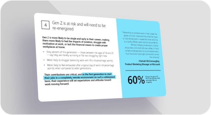Gen Z is at risk and will need to be re - energized 4 “Networking as someone early in their career has gotten so much more daunting since the move to fully remote work — especially since switching to a totally different team during the pandemic. Without hallway conversations, chance encounters, and small talk over coffee, it's hard to feel connected even to my immediate team, much less build meaningful connections across the company.” – Hannah McConnaughey, Product Marketing Manager at Microsoft Gen Z is more likely to be single and early in their careers, making them more likely to feel the impacts of isolation, struggle with motivation at work, or lack the financial means to create proper workplaces at home. • Sixty percent of this generation — those between the ages of 18 and 25 — say they are merely surviving or flat - out struggling right now. • More likely to struggle balancing work with life (+8 percentage points). • More likely to feel exhausted after a typical day of work (+8 percentage points) when compared to older generations. Their contributions are critical, and as the first generation to start their jobs in a completely remote environment on such a widespread basis, their experience will set expectations and attitudes toward work moving forward. 60% Between the ages of 18 and 25 say they are merely surviving or flat - out struggling