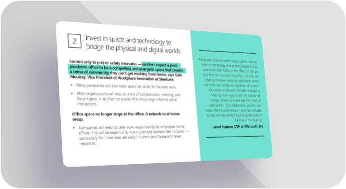 Invest in space and technology to bridge the physical and digital worlds 2 “Along with physical spaces, organizations need to invest in technology that enables people to fully participate from home, in the office, on the go, and from the manufacturing floor. This includes creating inclusive meetings experiences where everyone can contribute regardless of location. Our vision at Microsoft includes changes to meeting room layouts with the addition of multiple screens to create dynamic views of participants, chat, whiteboards, content, and notes. We’ll also enhance in - room technologies to help remote workers track and participate in the flow of the meeting.” – Jared Spataro, CVP at Microsoft 365 Second only to proper safety measures — workers expect a post - pandemic office to be a compelling and energetic space that creates a sense of community they can’t get working from home, says Gale Moutrey, Vice President of Workplace Innovation at Steelcase. • Many companies will also need space set aside for focused work. • Most organizations will require a mix of collaboration, meeting, and focus space, in addition to spaces that encourage informal social interactions. Office space no longer stops at the office. It extends to at home setup. • Companies will need to take more responsibility for employee home offices. This will be essential to making remote workers feel included — particularly for those who are early in career, and those with fewer resources.