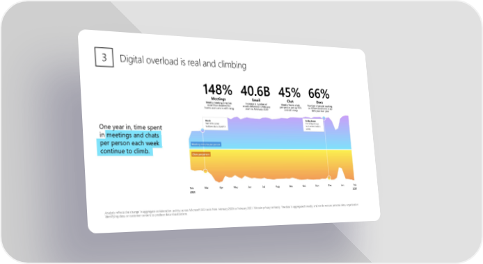 Digital overload is real and climbing 3 One year in, time spent in meetings and chats per person each week continue to climb. Analysis reflects the change in aggregate collaboration activity across Microsoft 365 tools from February 2020 to February 20 21. We take privacy seriously. The data is aggregated broadly, and we do not use personal data, organization identifying data, or customer content to produce data visualizations.