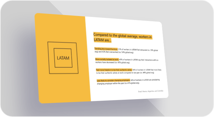 Compared to the global average, workers in LATAM are... Trending less toward burnout: 31% of workers in LATAM feel exhausted (vs. 39% global avg) and 42% feel overworked (vs. 54% global avg). More socially isolated at work: 49% of workers in LATAM say their interactions with co - workers have decreased (vs. 40% global avg). Feel more freedom to be their authentic selves: 54% of workers in LATAM feel more likely to be their authentic selves at work compared to last year (vs. 44% global avg). Less likely to consider changing employers: 36% of workers in LATAM are considering changing employer within the year (vs. 41% global avg). LATAM Brazil, Mexico, Argentina, and Colombia