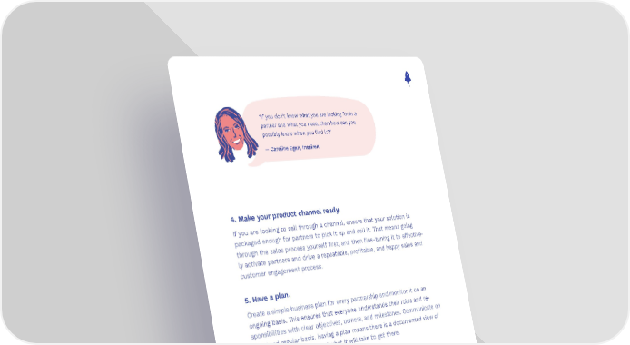“If you don’t know what you are looking for in a partner and what you need, then how can you possibly know when you find it?” — Caroline Egan, Inspiren 4. Make your product channel ready. If you are looking to sell through a channel, ensure that your solution is packaged enough for partners to pick it up and sell it. That means going through the sales process yourself first, and then fine-tuning it to effective- ly activate partners and drive a repeatable, profitable, and happy sales and customer engagement process. 5. Have a plan. Create a simple business plan for every partnership and monitor it on an ongoing basis. This ensures that everyone understands their roles and re- sponsibilities with clear objectives, owners, and milestones. Communicate on an agreed regular basis. Having a plan means there is a documented view of what success looks like and what it will take to get there. “Startups absolutely cannot afford to just bring on lots and lots of partners and spend all their energy to do that if those partners then don’t deliver.” —Caroline Egan, Inspiren 40