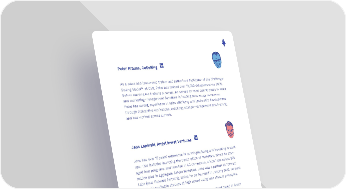 Peter Krauss, CoSelling As a sales and leadership trainer and authorized Facilitator of the Challenger Selling Model™ at CEB, Peter has trained over 10,000 delegates since 2006. Before starting his training business, he served for over twenty years in sales and marketing management functions in leading technology companies. Peter has strong experience in sales efficiency and leadership development through interactive workshops, coaching, change management and training, and has worked across Europe. Jens Lapinski, Angel Invest Ventures Jens has over 15 years’ experience in running/building and investing in start- ups. This includes launching the Berlin office of Techstars, where he man- aged four programs and invested in 40 companies, which have raised $75 million plus in aggregate. Before Techstars, Jens was a partner at Forward Labs (now Forward Partners), which he co-founded in January 2012. Forward Labs built profitable startups at high speed using lean startup principles. He is now the CEO of Angel Invest Ventures, an Angel Fund based in Berlin which makes ten to twenty angel investments each year. He is also an advi- sory board member at signals Venture Capital. 89